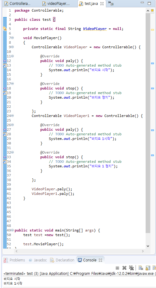 1. 비디오 플레이어는 play 와 stop 이라는 조작을 할 수 있다. 따라서 인터페이스 Controllerable 을 아래와 같이 정의 할 수 있다. Controllerable 인터페이스를 구현하는 VideoPlayer 클래스를 Test 클래스의 MoviePlayer() 메소드 안에 무명 클래스로 작성하고 테스트하시오.