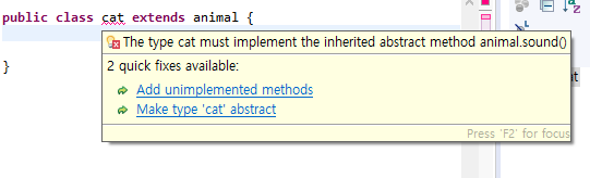 2. cat 클래스 또한 추상화된걸 정의하지않고 추상화도 사용하라고 메세지가 뜨게된다.