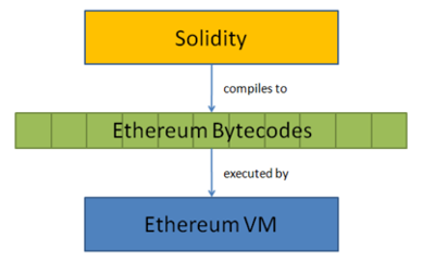 스마트 컨트랙트의 코드는 솔리디티로 작성한다. 작성된 코드를 컴파일시키면, 바이트코드 형태가 된다. (솔리디티 -> 고급언어 | 바이트코드 -> EVM이 이해 가능한 기계어)