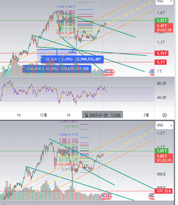 알트코인들은 각자 양상이 다르긴한데.. 대장격인 이더와 토탈차트들을 보면 현재 저항라인에서 저항받고 내려가는 모습입니다.