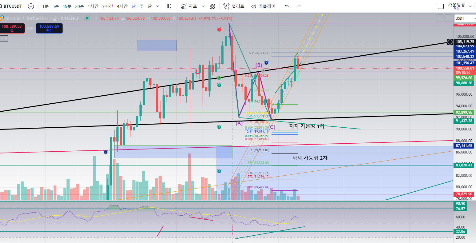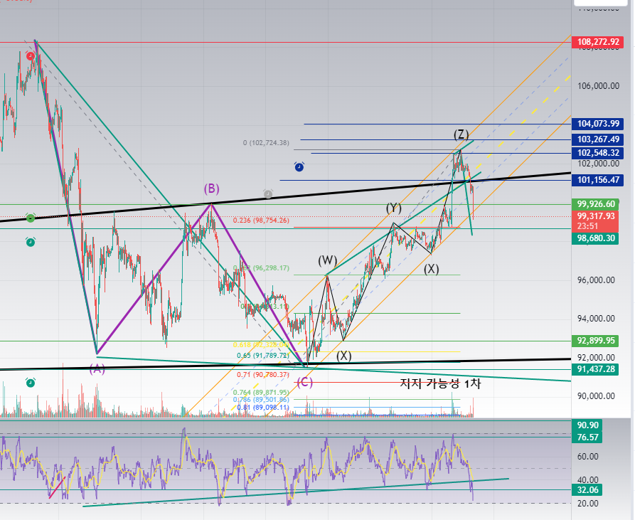 이전에 적었던 91k추세선을 당연히 뚫어줄줄 알았는데 잘 지켜주는 모습이네요.