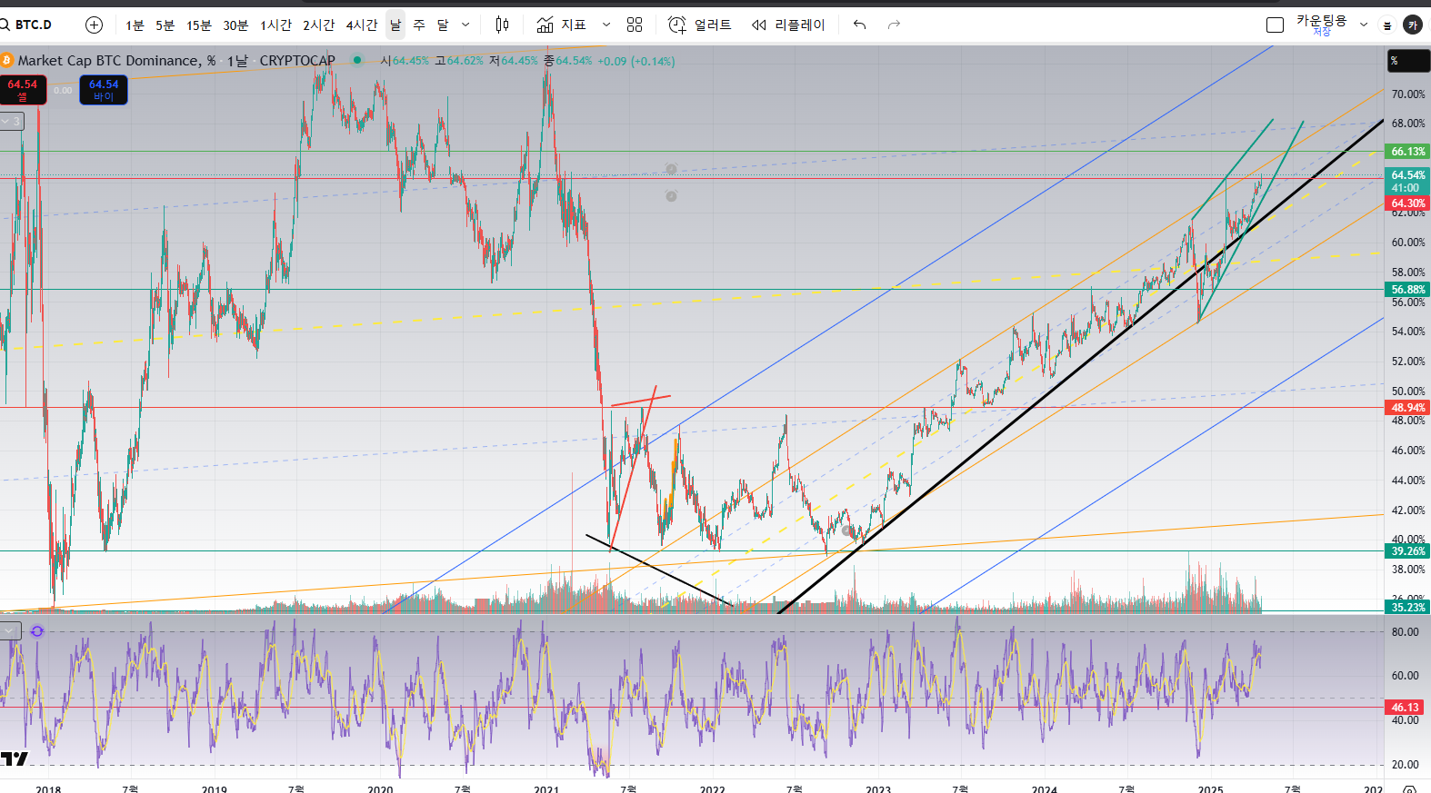 비트코인 도미넌스 입니다. 끝도 없이 오르고 있습니다.