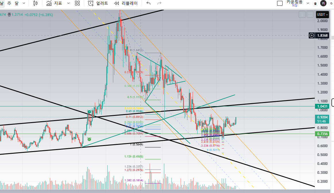 현재, 차트상으로 주요 채널을 뚫고 상승하는가 싶더니, 다시 채널안으로 들어왔습니다. 이대로 하락으로 진행된다면 코인시장에는 정말 큰 불장, 상승이 올 것이고. 다시 채널상단을 뚫고 올라간다면, 당분간 조정장이 이어질 것으로 생각됩니다. 얘는 뭐 뚫고 내려오고 있어서 유의미하게 볼 수 있나 싶네요.. 일반적이라면 보통 쭉 내려갈텐데.. 알트 지금이 풀 매수 시점인가..?