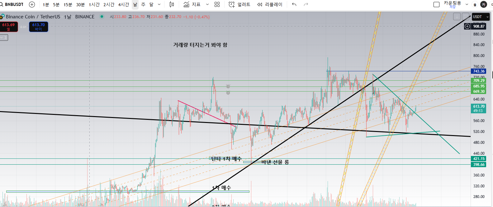 설마 이 채널 상단 고점을 두드리러 가진 않겠죠..? 가면 알트 일단 풀매수.. 이더리움이 그땐 얼마이려나.. 진짜 한 700달러 갈수도 있겠네요.