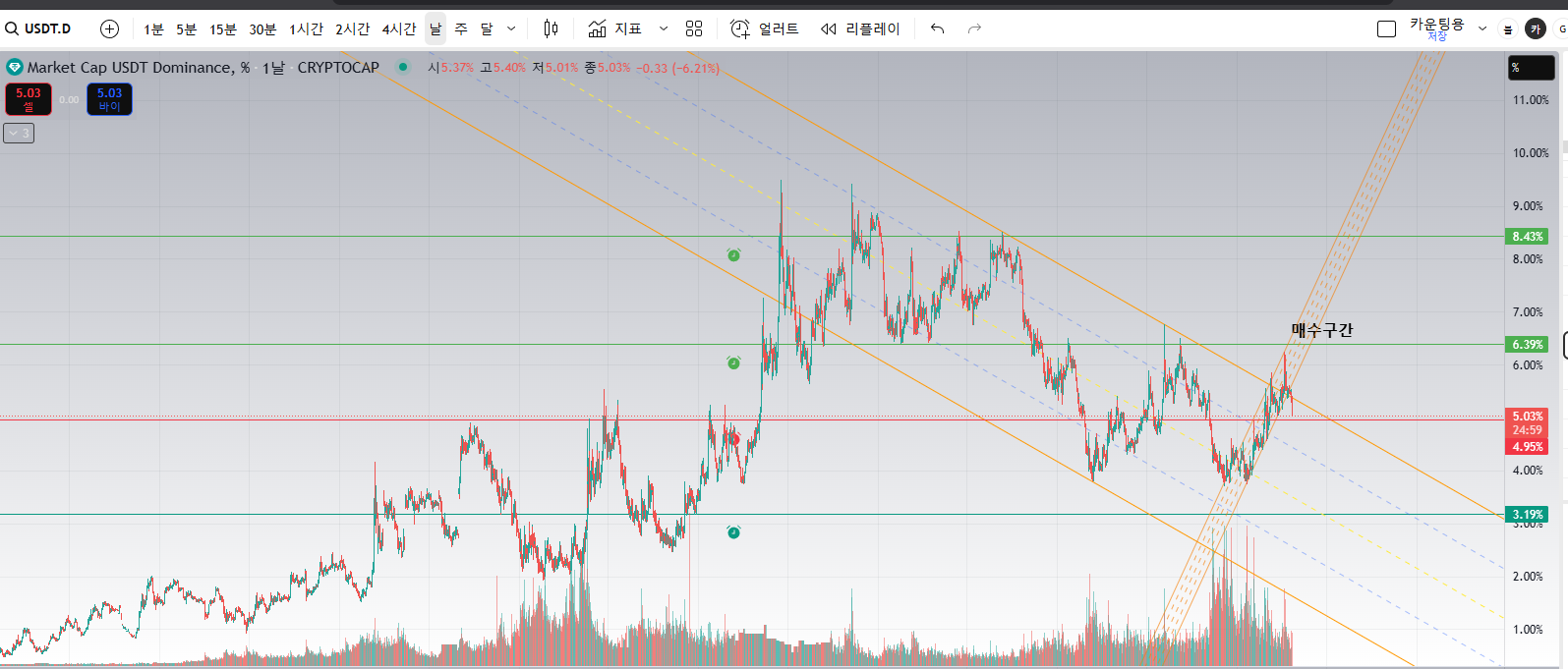 테더 도미넌스는 오르면 코인시장의 가격이 하락한다는거고, 내리면 코인시장의 가격이 오릅니다.