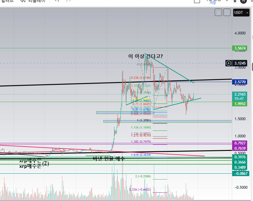 그나마 리플이 좀 잘 버텨주면서 추세 뚫렸지만, 다시 안으로 들어오는 등 잘 하고 있죠.. 근데 이미 삼각수렴인 척 깬건 올라와도 이런건 다시 내려갈 확률이 더 높다고 생각하고있습니다.