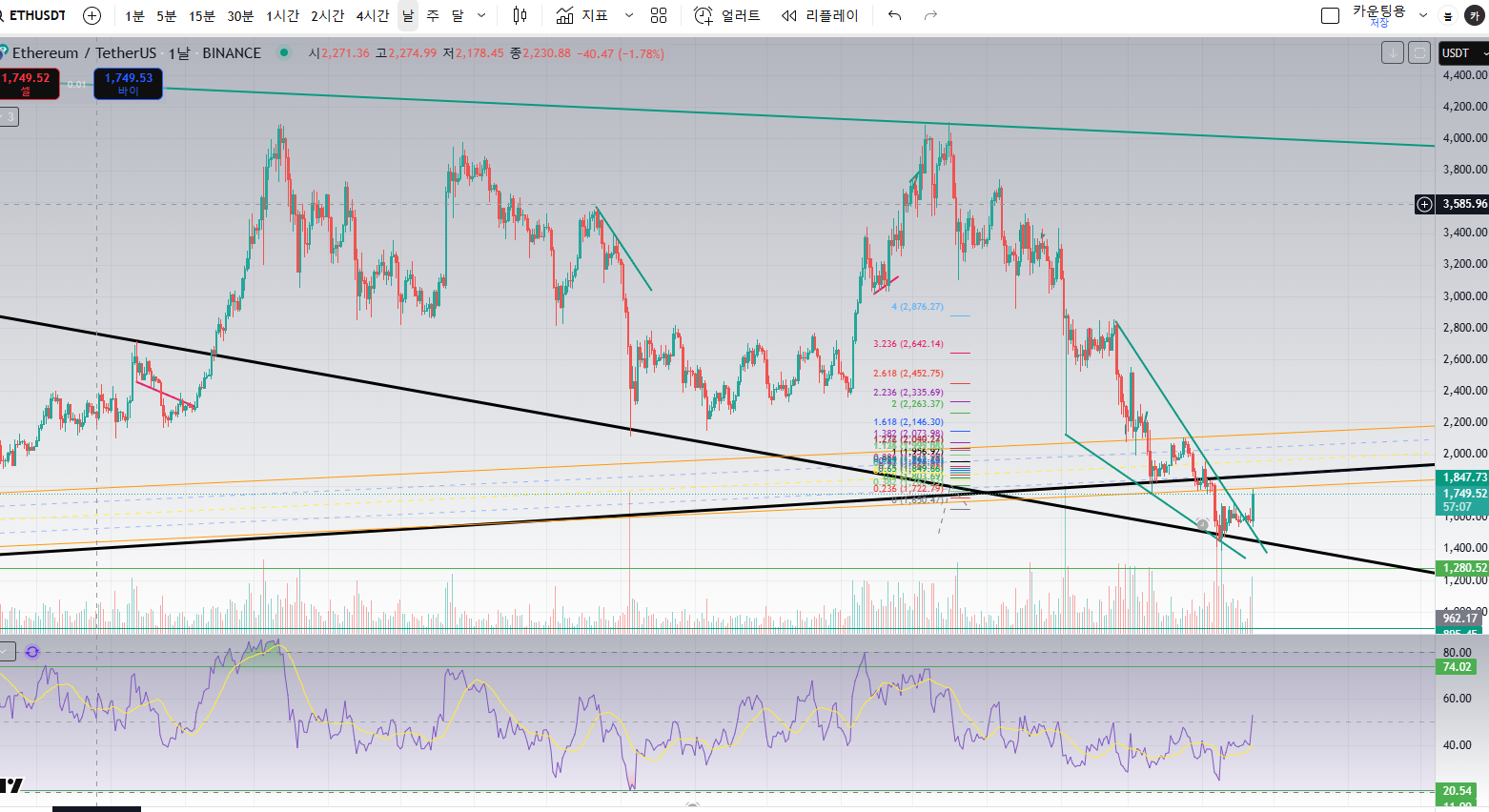 솔라나도 주요 저항구간 다왔고.. 이거 뚫고 올라타면 내린 하락이 한번 끝났다고 보고, 다시 해당 선에 도달할 때 매수하면 c파 먹을 수 있을 것 같습니다. 근데 아직 못뚫었죠.. 못뚫으면 50달러까지도 보이네요.
